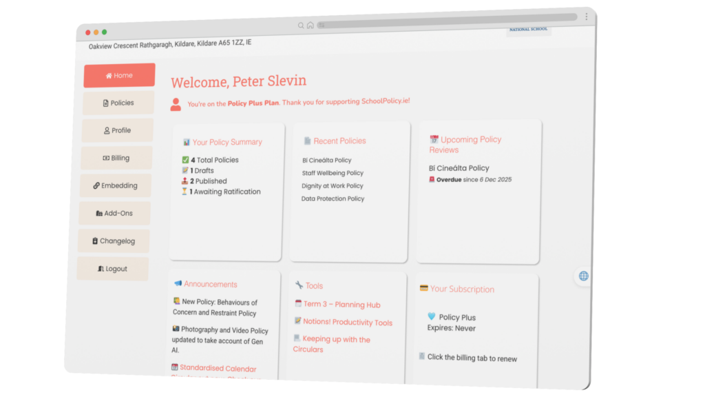 Designed for real Irish schools. Personalised policies can be published in a couple of clicks. Clean, clear, and useful. Also comes with all the templates you need.